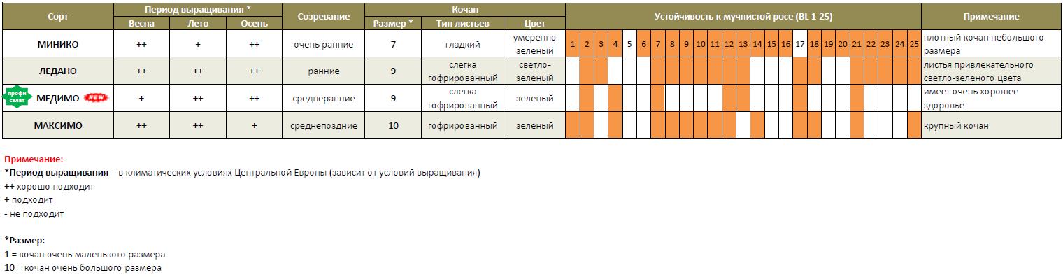 Устойчивость: BL – ложная мучнистая роса: 1, 2, 4-12, 21, 24, 25. Ценность сорта: дружное формирование
