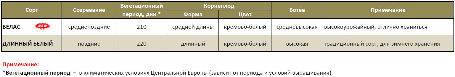 Корнеплоды белые, конической формы, длиной 25-30 см с заостренным кончиком.